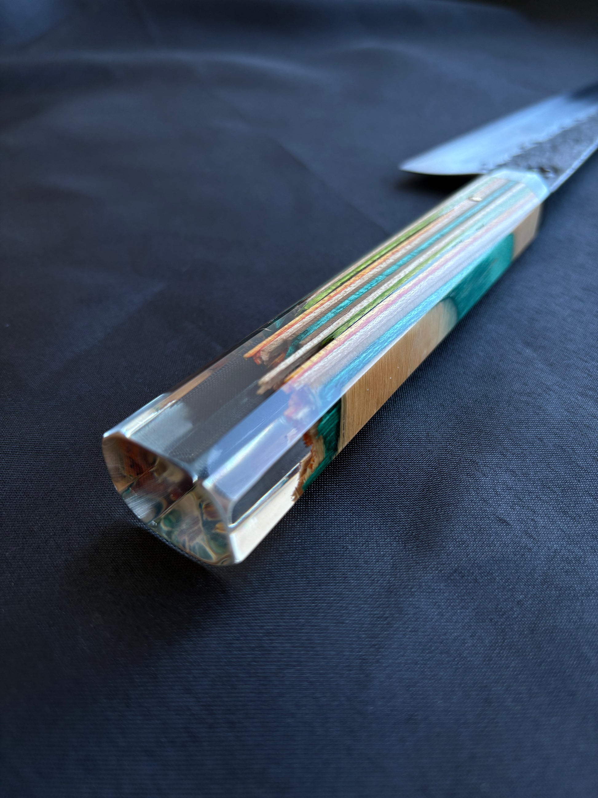 This blade is forged from 1084 high carbon steel with an S grind for less friction when cutting and food release. Each handle is from a different broken skateboard that has been casted in a shatterproof resin. Everything is pinned together with a brass pin.
