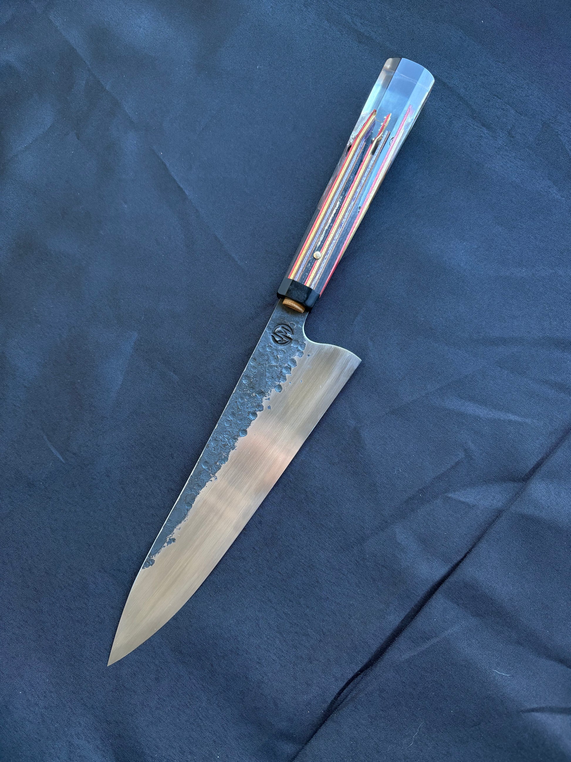 This blade is forged from 1084 high carbon steel with an S grind for less friction when cutting and food release. Each handle is from a different broken skateboard that has been casted in a shatterproof resin. Everything is pinned together with a brass pin.
