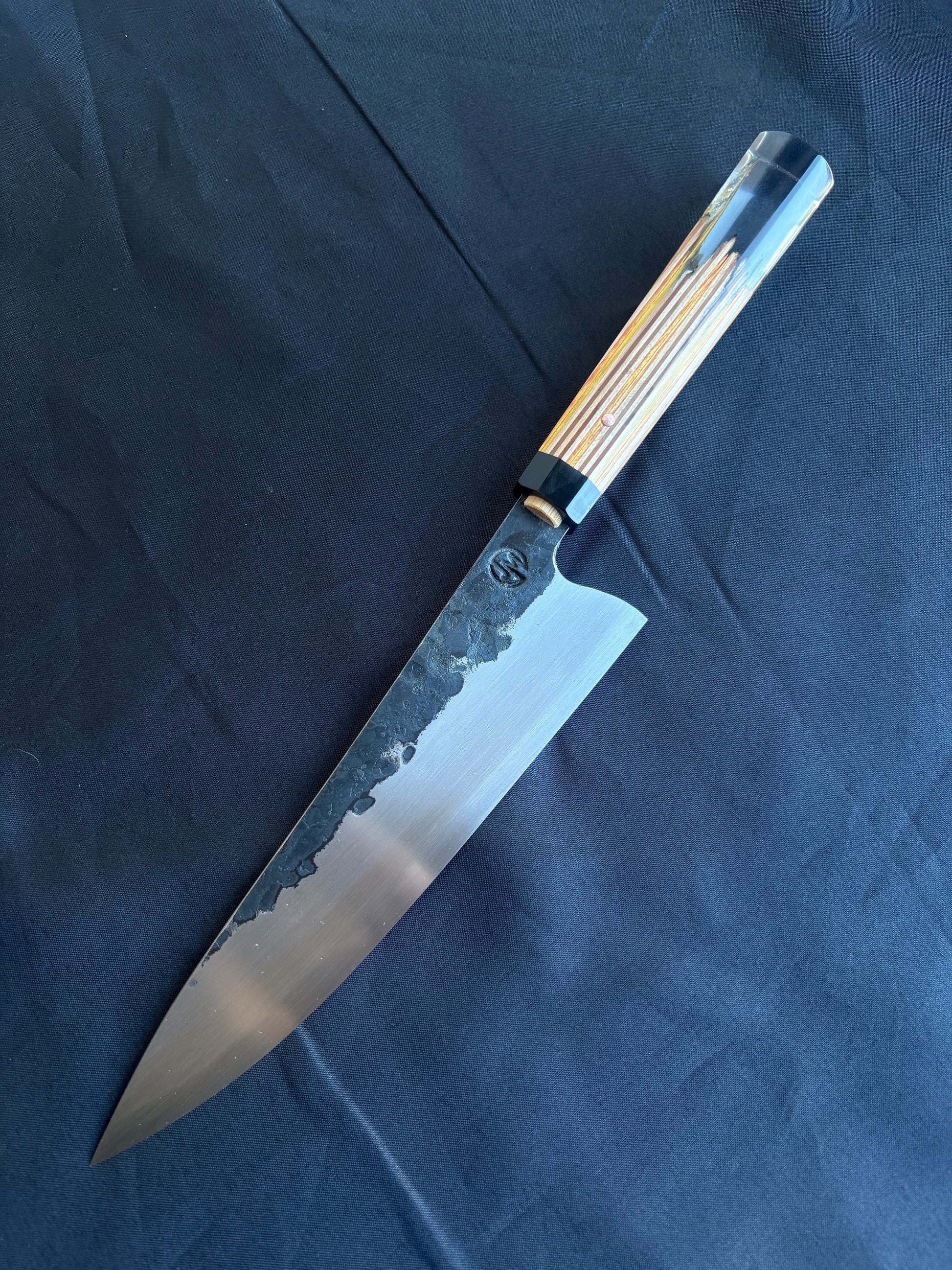 Forged from 1084 high carbon steel with S – grind for less friction when cutting and food release. Handle is stacked broken skateboard and clear resin