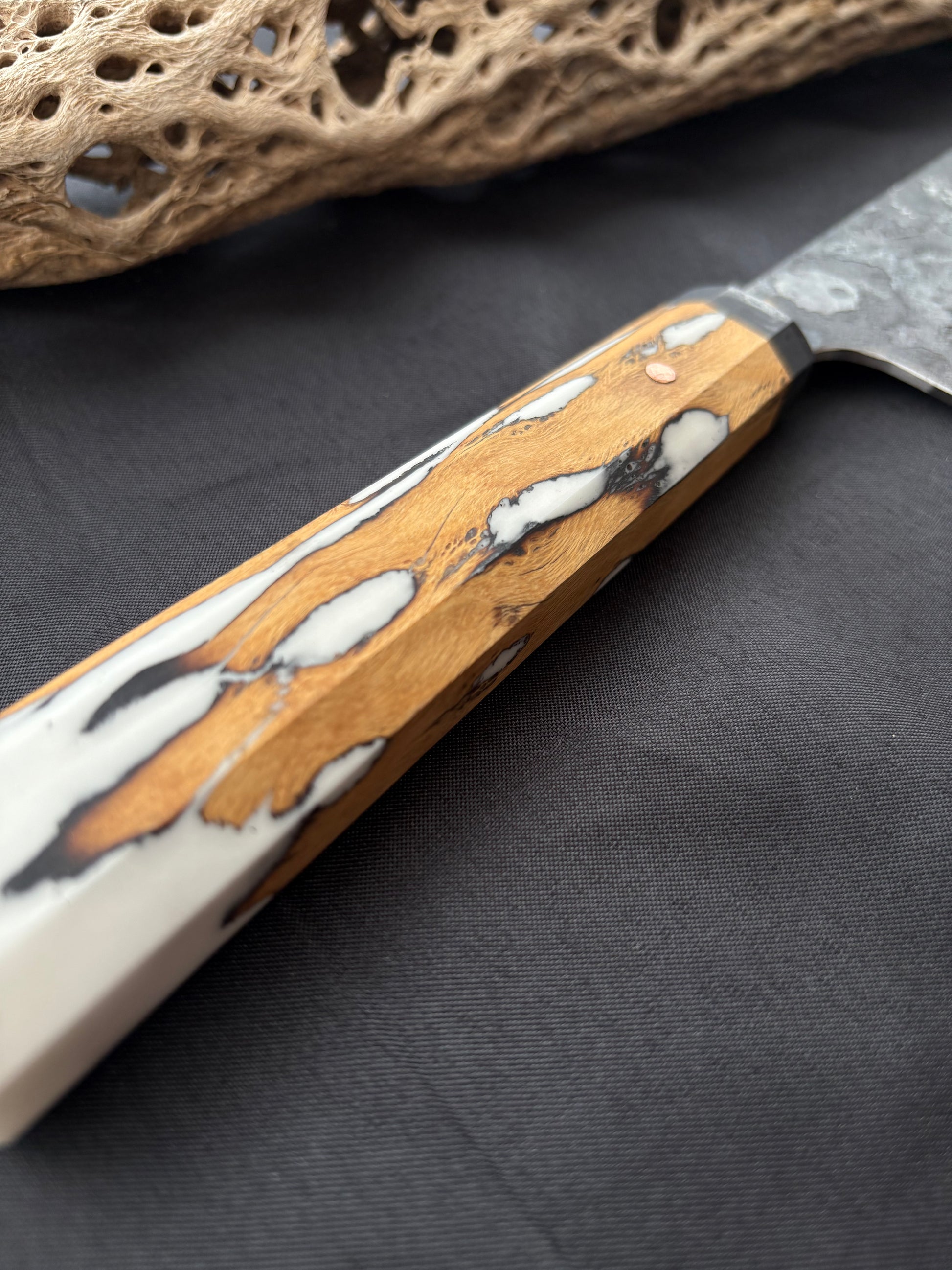 Forged from 1084 high carbon steel with convex grind. Handle is burnt cholla with white resin pinned with copper pin.