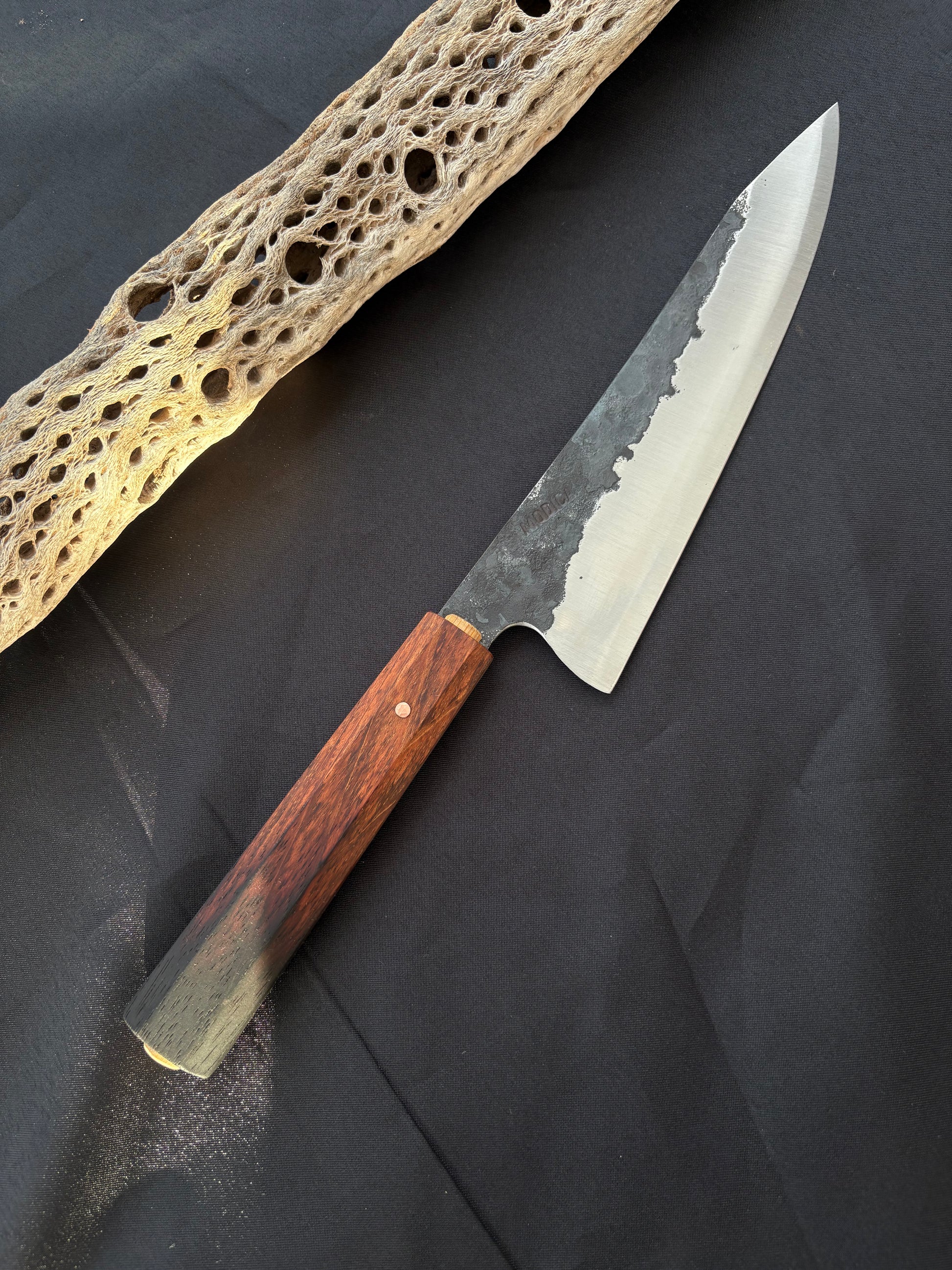Forged from 1084 high carbon steel with s grind for less friction when cutting and food release. Handle is Jatoba and bamboo with copper pin