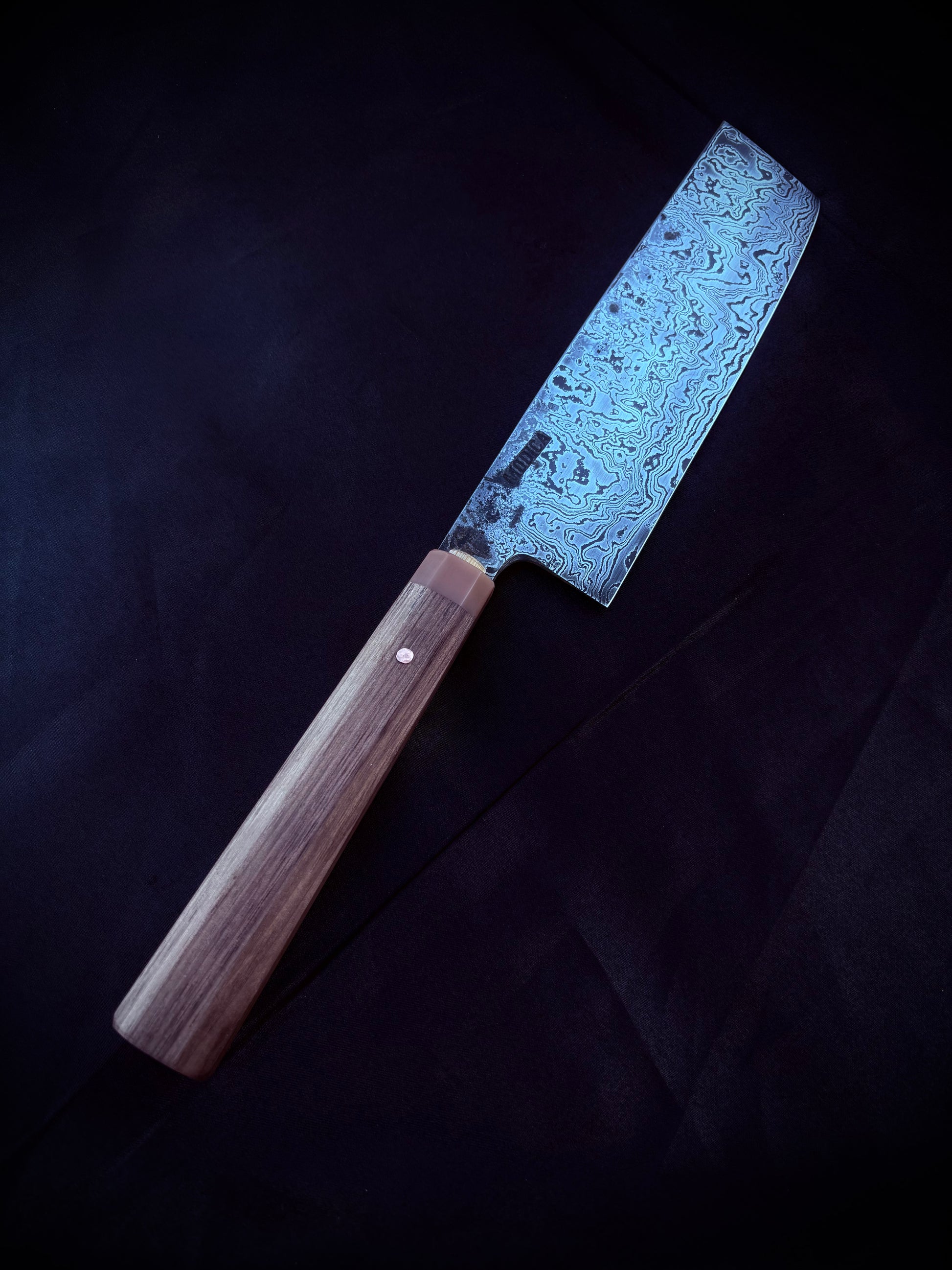 Damascus steel made from 1084 and 15n20 handle is coffee resin collar and stabilized walnut.