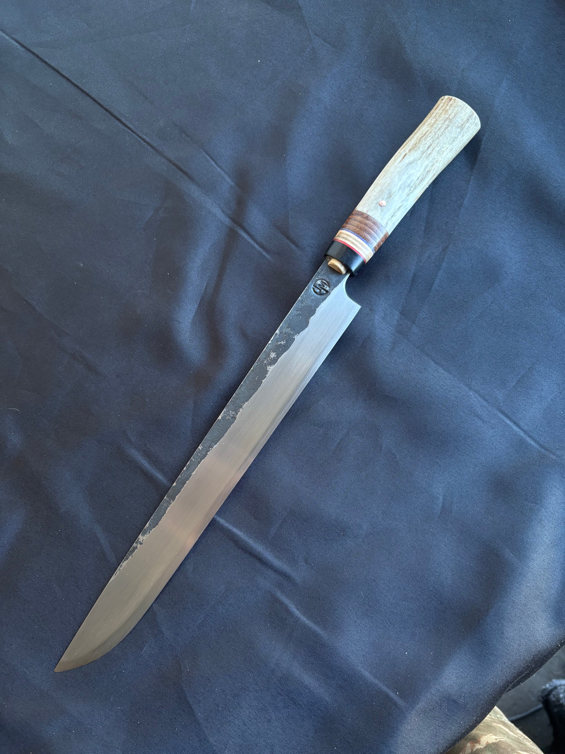 Forged from 1084 high carbon steel with S – grind for less friction when cutting and food release. Handle is stacked leather skateboard, and Elk antler.
