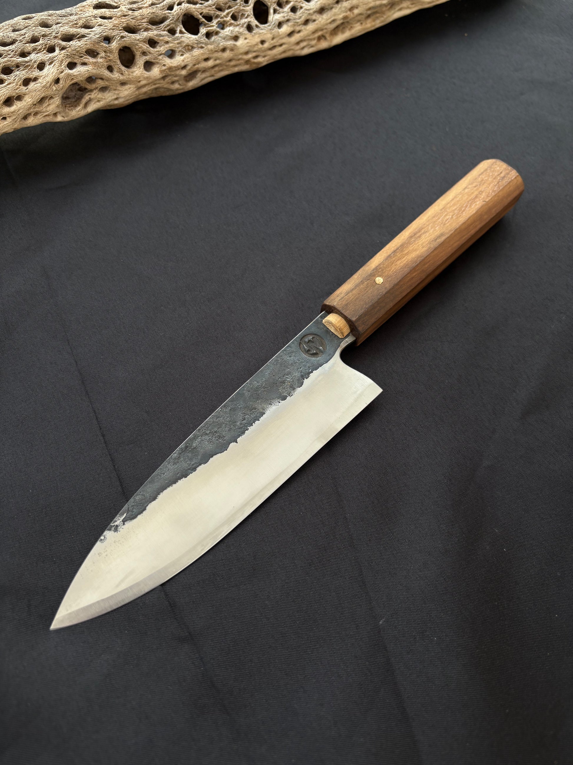 Forged from 1084 high carbon steel with s-grind for less friction cuts and food release grind. Handle is walnut and bamboo with copper pin